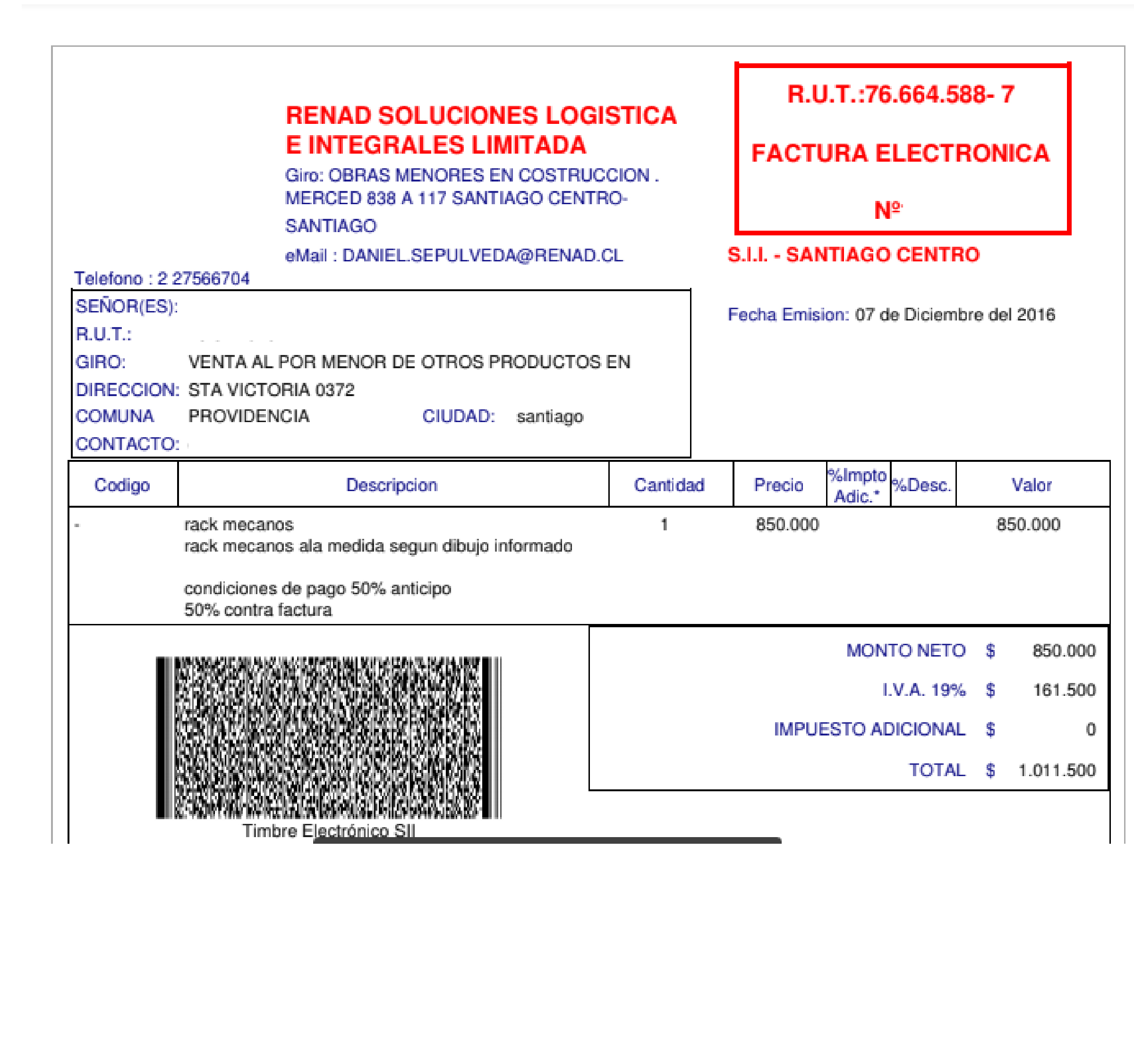 Empresa Renad Rut:76.664.588-7, empresa que hace Racks y uno les transfiere por adelantado y después no hace los servicios, nos estafo con $1,000.000 .